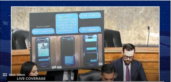 In one text, the shooter linked to an article about the incident and bragged: “I fired 5 rounds and she had 7 holes. Put that in your book boys.”